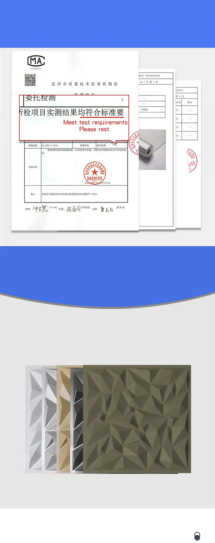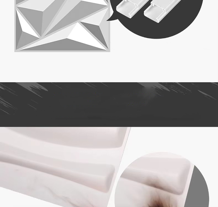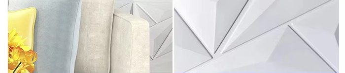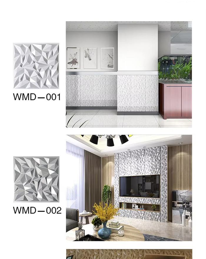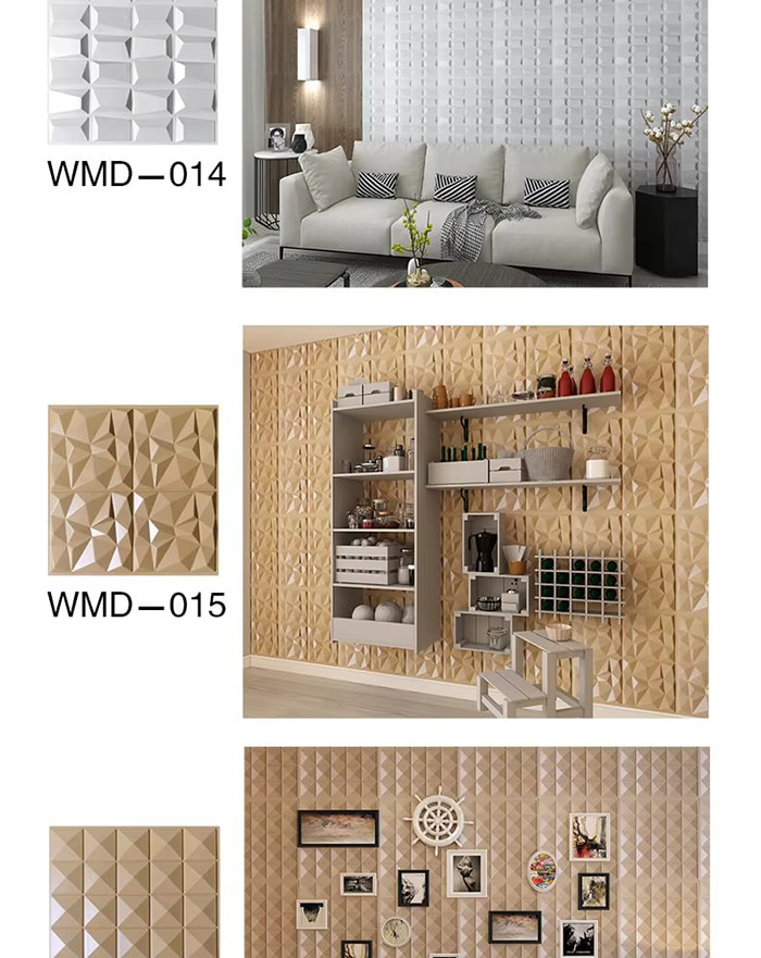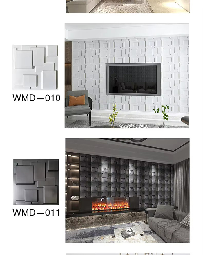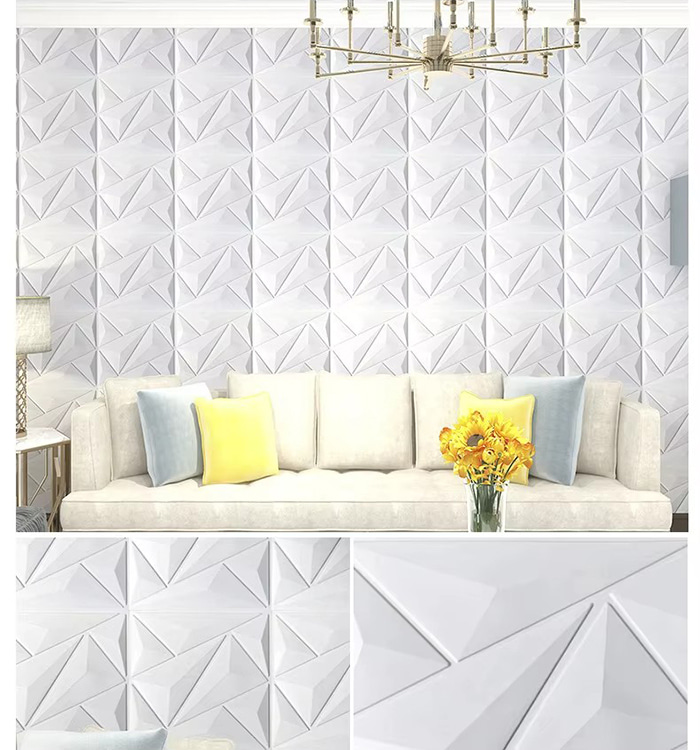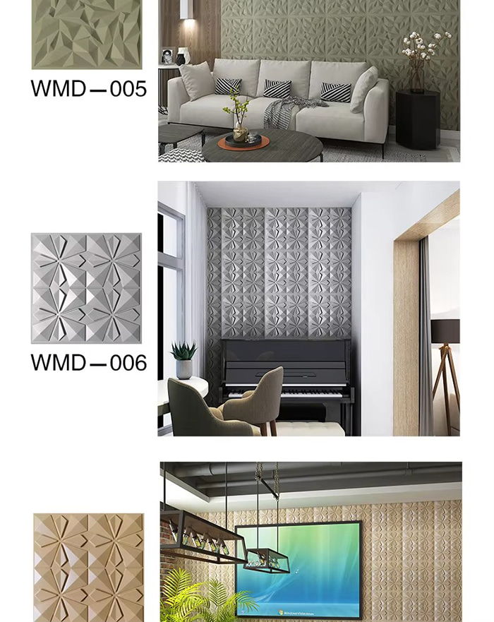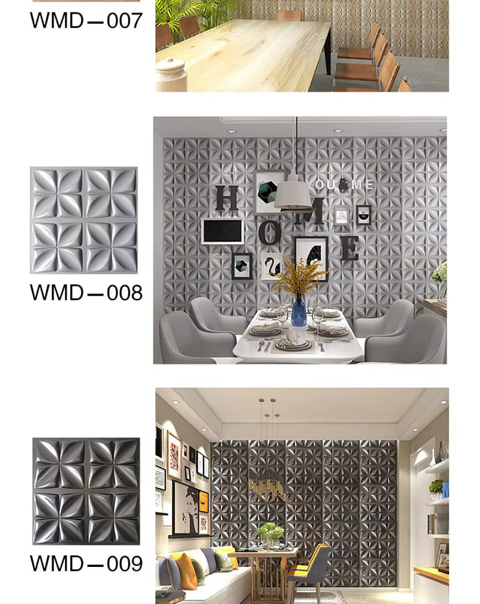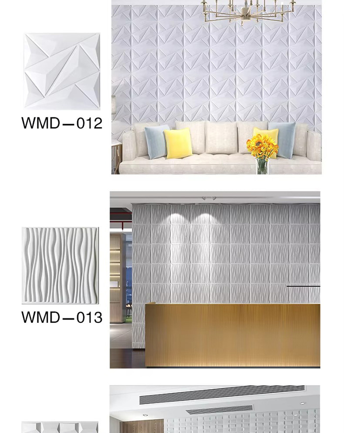 Is cineál nua ábhar maisiúcháin iad painéil balla 3D. Trí bhrú te múnla, greanadh agus muilleoireacht nó priontáil CNC, cruthaítear patrúin tríthoiseach ar dhromchla na bpainéal. I measc a bhunábhair tá PVC, bord dlúis, cóimhiotal alúmanaim, snáithín bambú, srl. Tá éifeacht amhairc tríthoiseach ag painéil bhalla 3D. Trí phrionsabal an athraonta solais agus scáth, déantar an t-eitleán 2D a chlaochlú go héifeacht amhairc 3D le tuiscint ar dhoimhneacht, agus déantar an ciseal amhairc a mhéadú níos mó ná 3 huaire faoin limistéar céanna.