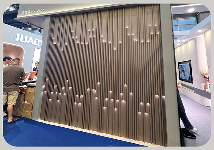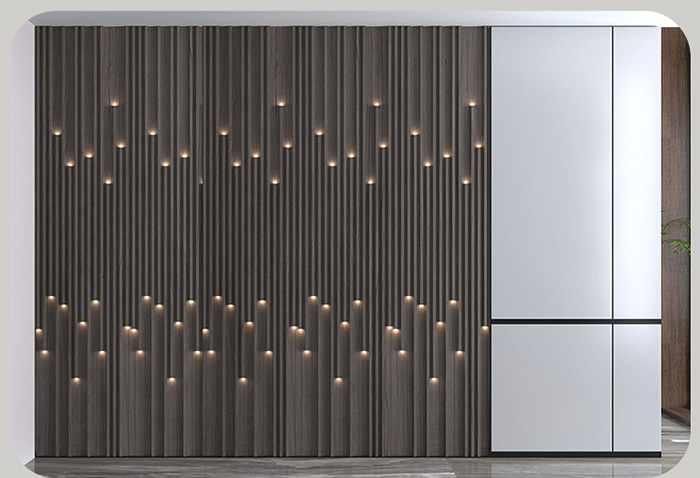 Is táirge nuálaíoch iad painéil balla ghríl lonrúil a chomhcheanglaíonn teicneolaíocht nua-aimseartha le heistéitic maisiúil. Úsáideann siad ábhair atá neamhdhíobhálach don chomhshaol mar WPC, agus baineann siad éifeachtaí lonrúil amach trí snáithíní optúla a ghreamú nó a neadú ar dhromchla na bpainéal. Ní hamháin go bhfuil dea-airíonna maisiúla ag an gcineál seo de phainéal balla, ach soláthraíonn sé soilsiú bog freisin, rud a chuireann le tuiscint ordlathas agus atmaisféar an spáis. Is féidir a dhromchla a mhaisiú le héagsúlacht dathanna gráin adhmaid nó a chomhcheangal le hábhair eile chun freastal ar riachtanais dearaidh éagsúla.